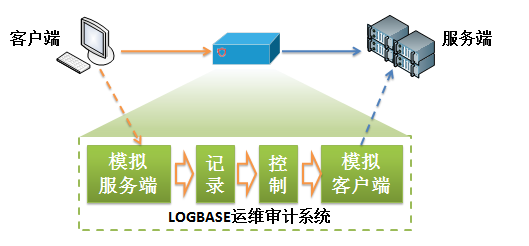 Logbase运维安全审计系统采用协议代理方式对各种维护协议进行转发,并在转发的过程中分别模拟了协议的客户端与服务端,具体如下图所示: