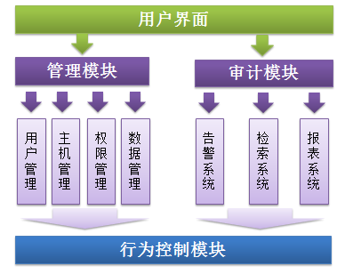 Logbase运维安全审计系统采用模块化设计,主要由以下模块组成:行为控制模块、审计模块、管理模块、存储模块、用户管理接口模块,各模块间关系如下图所示: